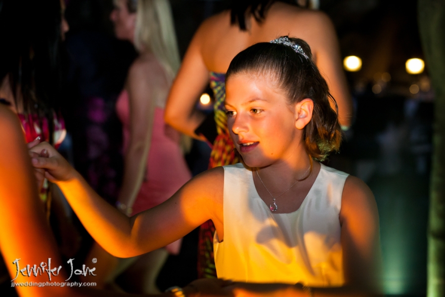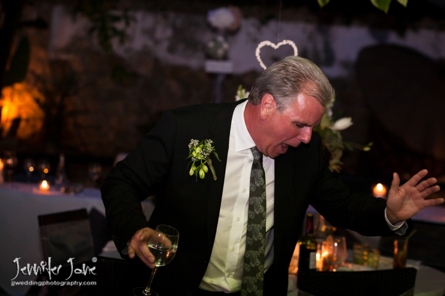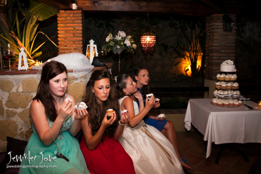 Swing style music was sung as guests lined up to congratulate the happy couple while cocktails were served and people gathered to chat. Everyone started to really enjoy the day and the traditional confetti was thrown at the happy and smiling Bride & Groom. Emma & Paul did not have a planner but I was able to advise them when and where certain parts of the wedding should happen and after a short while took some family and friends aside for some photographs and group shots. The rest of the guests started to join us at the lower level of Nueva Kaskada where the meal was to be served and the evening entertainment would take place. We had just enough time for some lush green backdrop portraits, very nice and green for this time of year. The wedding flowers and table decorations looked even more gorgeous thanks to the extra effort always put in by Maryanne of In Bloom Flowers. I advised that the speeches should be before the meal if possible as it gets any nerves out of the way and allows speakers to enjoy their meal. The speeches were funny, meaningful and after some gifts were handed to people that had helped with the wedding arrangements, guests who had travelled from different countries were thanked. The food cooked by the Michelin Star chef Ewald Fichthaler was absolutely exquisite and enjoyed by all. The cake was cut to mark the end of the meal and Paul thoughtfully gave cupcakes from around it to the kids.